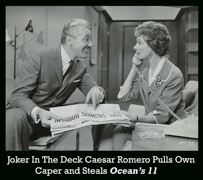 The guy what steals Ocean's 11 is Caesar Romero. He pretty much takes charge of the third act. Did Frank and company know or care about this Joker's heist? A group of five to whom I ranOcean's 11 last week all agreed it was Romero's show from the robbery's finish on in. 1960 observers thought so too. Several polls place him in supporting Oscar nominee contention forOcean's 11, observed Variety in December of that year. Caesar himself got out a trade ad to spread word of critic's approval (above). For my money, he's the cool cat in this show --- suave, unflappable and making most of scenes via commitment several times that of blasé Rat Packers. One scene Sinatra would undoubtedly have ordered reshot, had he noticed, shows CR entering a room and towering over the diminutive star. Did Romero get his lion's share of Ocean's 11 for showing up to work as opposed to oft-truant principal players? My viewing group came away from Ocean's 11 wishing he'd framed the caper ... maybe in that event it would have come off successfully.